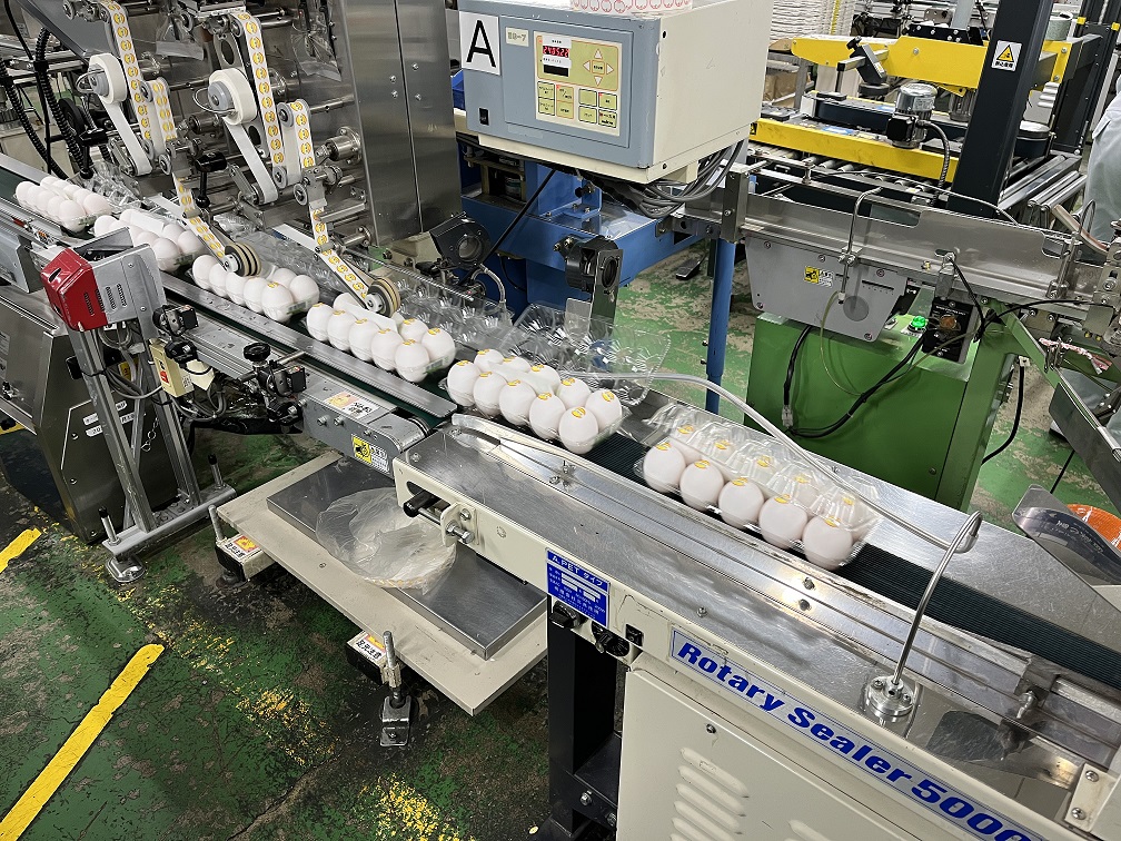 1時間あたり40,000個を処理できる設備が2基、当GPでは稼働しており、10個入りパックに換算すると、毎時8,000パックの生産ができます。